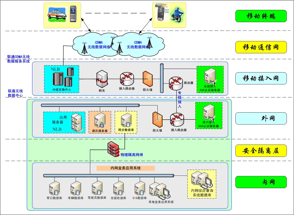 为保证公安内网系统数据的安全性,本系统建立了一条与公安专网相连的安全专用通道,使公安移动终端访问只限公安专网,与公网(包括互联网)完全隔离。